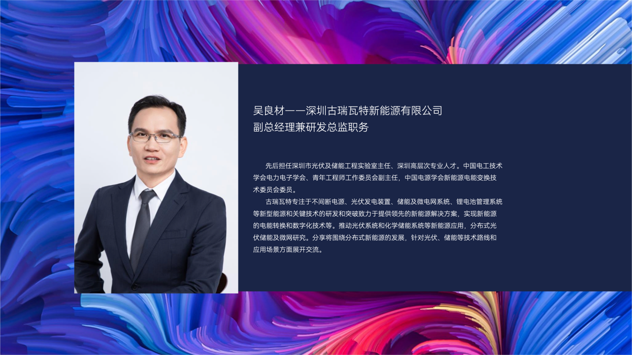 深圳古瑞瓦特新能源有限公司在户用光伏逆变器、用户侧储能逆变器出货量方面,均位列全球领先,在光伏领域技术层面已名列世界前茅。首席技术官吴良材先生分享“用户侧光伏储能应用前景及解决方案”。全球能源格局正在从化石能源向可持续能源驱动的零碳经济转型,“碳达峰、碳中和”等目标相继提出,在微网、户用、工商业应用场景下,古瑞瓦特的产品均在发挥着重要作用,同时在电池有效利用率提升方面也贡献了优质技术。