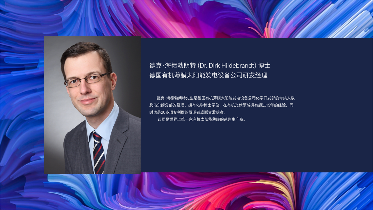 德国有机薄膜太阳能发电设备公司海勒泰克是全球第一家有机太阳能薄膜的系列生产商,其研制的有机太阳能薄膜具有超薄超轻、灵活可弯折、绿色环保等优势特点。公司研发经理德克·海德勃朗特博士分享了其公司的有机太阳能薄膜,该产品可用在建筑体外墙等场景,具有超薄超轻、灵活可弯折、绿色环保等优势特点。耐用性方面表现也非常出色,能够长期提供源源不断的太阳能。海勒泰克连续十多年在有机薄膜太阳能发电领域占据光转换电率(25%)世界第一。