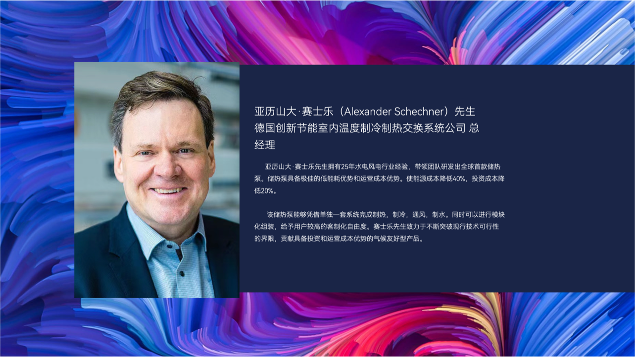 德国创新节能室内温度制冷制热交换系统公司恩沃拉总经理亚历山大·赛士乐先生分享了极具能效和成本优势的储热泵系统,该系统是全球首款储热泵,一套系统即可完成制冷、制热、通风、水体加热等功能。从数据方面看,该产品具有成本及能效优势,二氧化碳排放量上也是同类产品中最小的,能够为各类建筑、储能方案提供极高的使用价值。