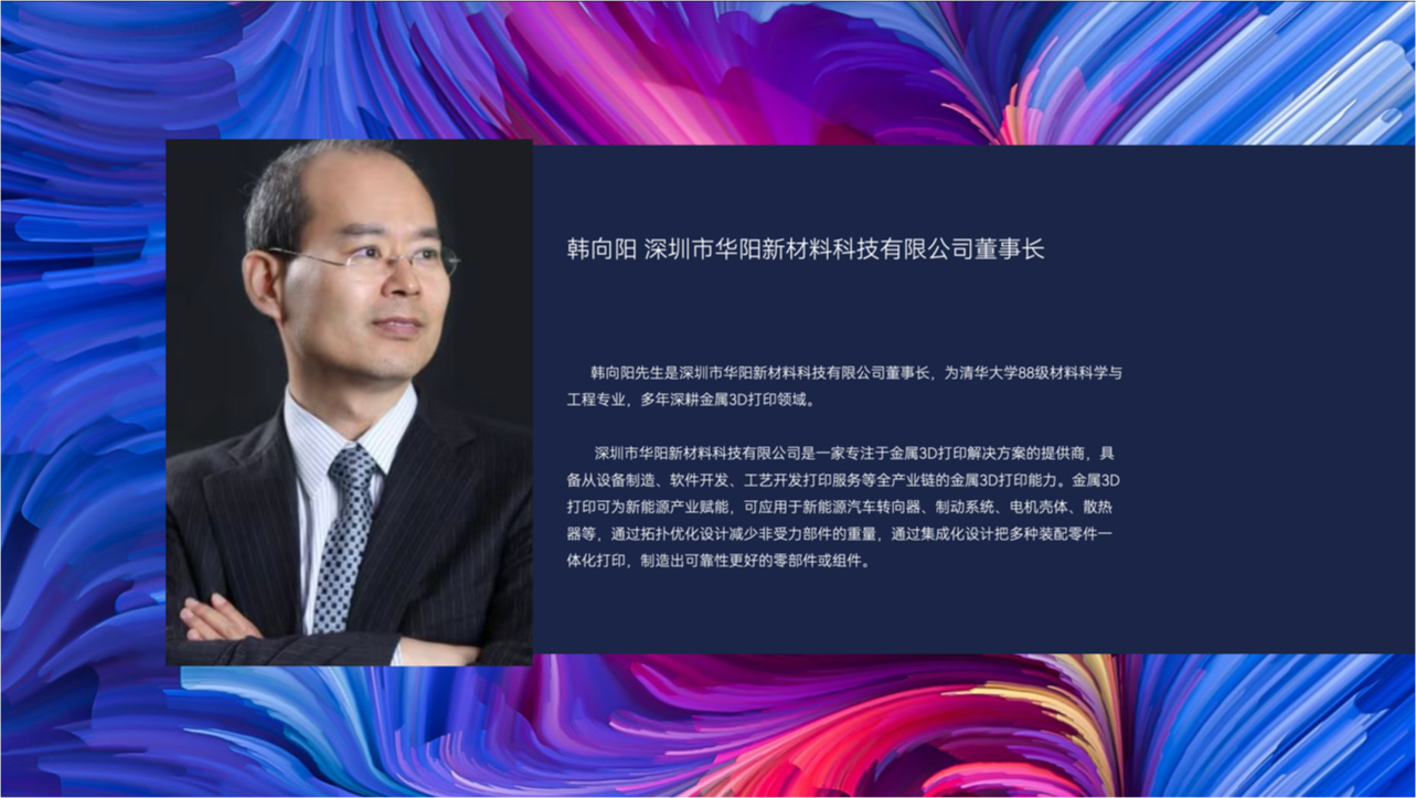 深圳市华阳新材料科技有限公司董事长韩向阳为大家带来的是3D打印增材制造在新能源领域中的应用。3D打印增材制造被誉为将引领“第三次工业革命”的关键技术之一,近年来得到各国高度重视和国内外学者的广泛研究,深圳市华阳新材料科技有限公司在该领域不断为市场贡献优秀产品。