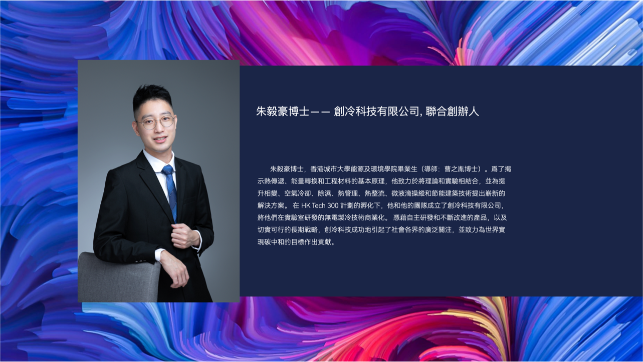 来自中国香港的创冷科技有限公司分享了极具创新性的无电制冷技术,公司联合创始人朱毅豪博士结合公司独创的ipaint涂料讲解了如何实现无电制冷。ipaint涂料可以显著降低物体表面温度,应用场景也相当广泛,小到服饰衣装,大到汽车、建筑外墙、仓库屋顶、船舶航运等,极具有市场发展潜力。
